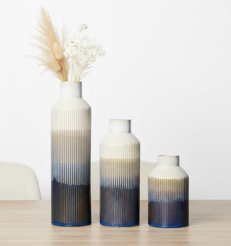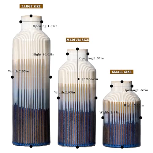 Vase Set:This ceramic vase set includes three sizes: Large (10″ H × 2.9″ W), Medium (7.67″ H × 2.9″ W), and Small (5″ H × 2.9″ W)