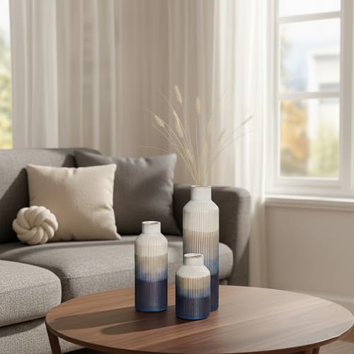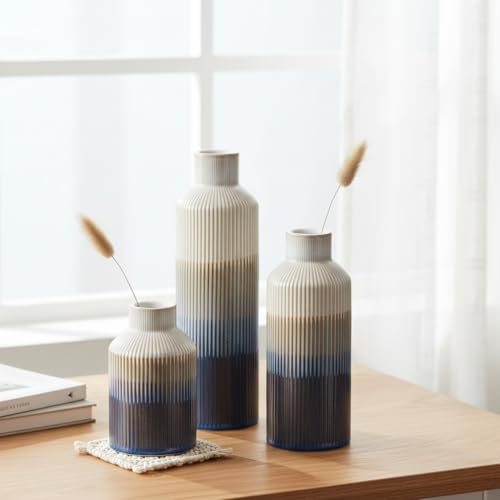 Blue and White Vase Set of 3, Blue Ceramic Flower Vase, Modern Decorative Vase for Home Decor, Table Mantel Entryway Shelf Living Room Kitchen Bathroom Decor
