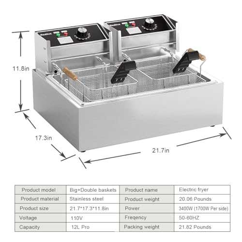 【Electric Deep Fryer】Equipped with 1700W×2 U-Shaped heating tubes, 10.7 QT×2 Oil Tank、11.16QT Large Basket and 6.35 QT×2 Baskets. The temperature can be controlled within the range of 140°F (60°C) – 390°F (200°C);