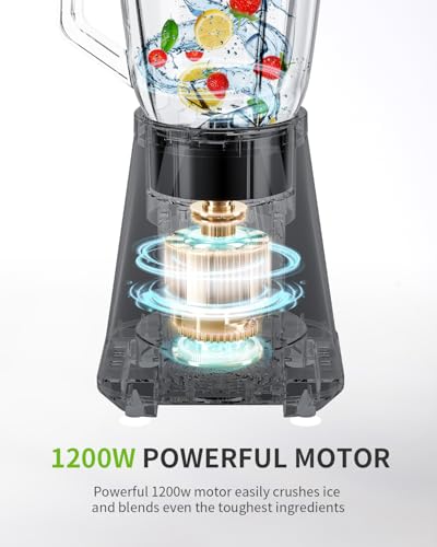 [1200W Powerful Blender]: With a 1200W powerful motor, crushing ice and frozen fruit quickly and efficiently to create delicious juices, smoothies, milkshakes and more.