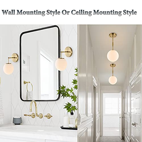 Modern Wall Sconce Industrial Mid Century Bathroom Vanity Wall Light with White Globe Glass Lampshade Brushed Brass Finished Lighting Fixture (Gold Color)