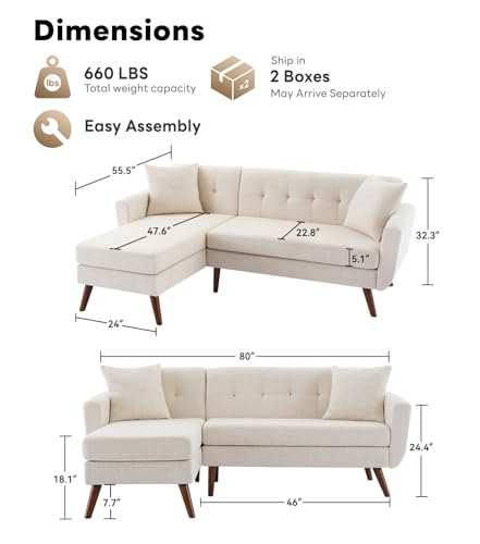 Tbfit L Shaped Couch Sofa, 80″ W Mid-Century Modern Sectional Couches, 3 Seater Sofas with Wide Chaise Lounge, Button Tufted Upholstered Sectional Sofa for Living Room, Bedroom, Beige | linen fabric, button tufted, solid wood foot, pocket spring, wood slats frame
