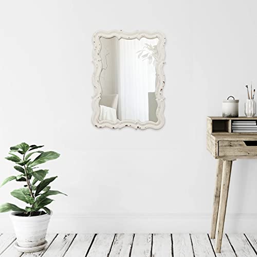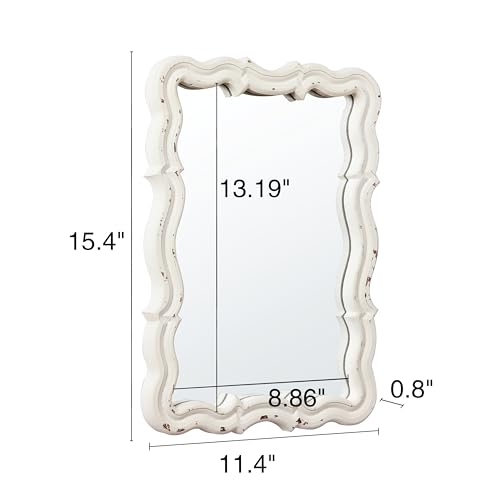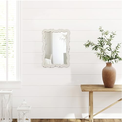 Vintage Small Scalloped Wall Mirrors Decorative 16 x 12 inch, Hanging Distressed White Sculpted Wood Bathroom Vanity Mirror, Rustic Entryway Mirror, Farmhouse Wall Mounted Mirrors